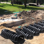 After wastewater from the home flows into the septic tank, it separates into three elements as it is being digested by the anaerobic bacteria inside the tank – sludge, scum, and effluent. Sludge is the solid waste that sinks to the bottom. Oil and grease float to the top, forming the scum. Effluent is the liquid waste that’s left over. This effluent flows out of the tank through an array of perforated pipes buried 3-4 feet underground and surrounded by soil or gravel. This is the septic drain field (also called a leach field).